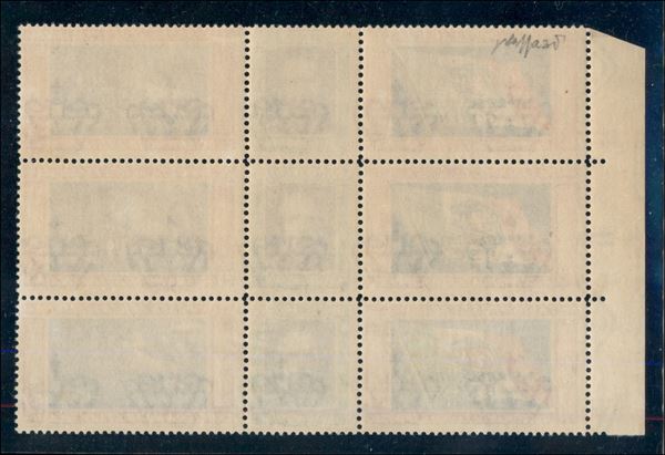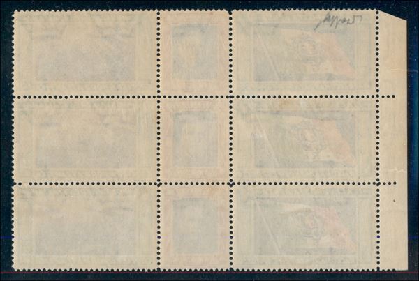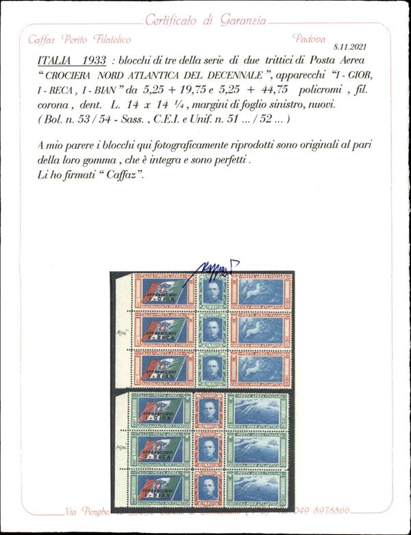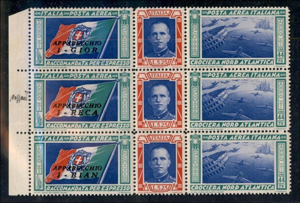1933 - Bellissimo blocco di tre bordo di foglio dei Trittici I-GIOR/I-RECA/I-BIAN (51/52 B-g-q) - gomma integra - cert. Caffaz