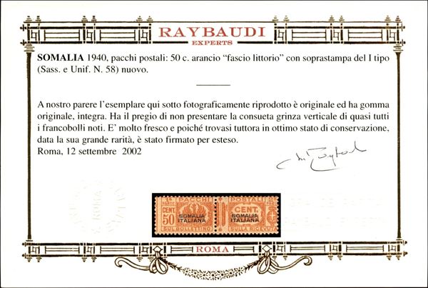 1940 - Freschissimo 50 cent arancio (58) con soprastampa del I tipo - gomma integra - molto bello e raro - cert. oro Raybaudi