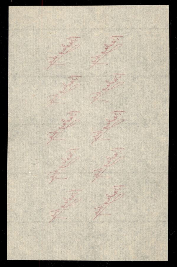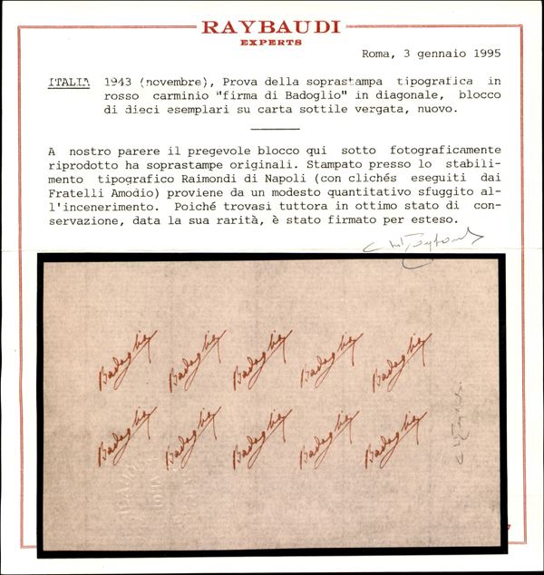1943 - Firma di Badoglio - Prova della soprastampa in rosso carminio - blocco di 10 esemplari su carta sottile vergata - senza gomma - molto raro - cert Raybaudi
