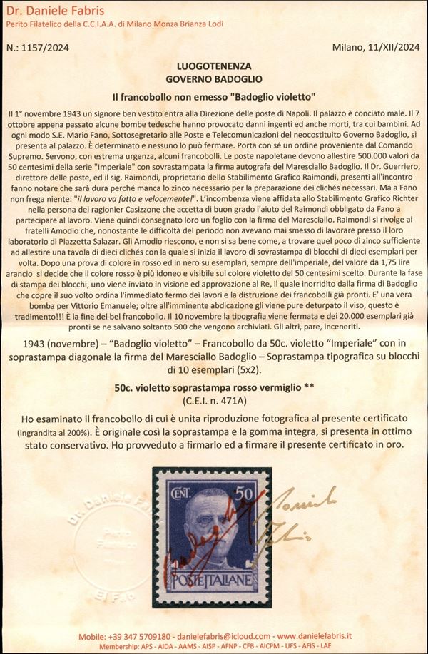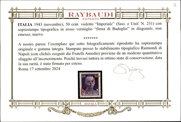 1943 - Non Emesso - Firma Badoglio su 50 cent Imperiale con soprastampa rosso vermiglio (CEI 471A) - nuovo con gomma integra - cert. oro Raybaudi + cert. oro Fabris