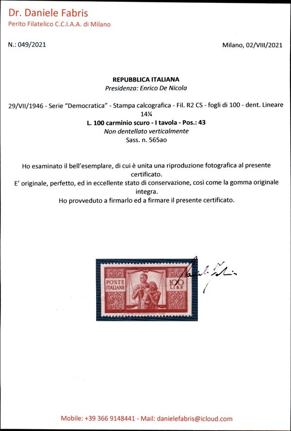 1946 - 100 lire Democratica (565ao) non dentellato verticalmente - gomma integra - cert. Fabris