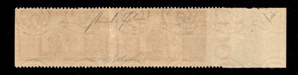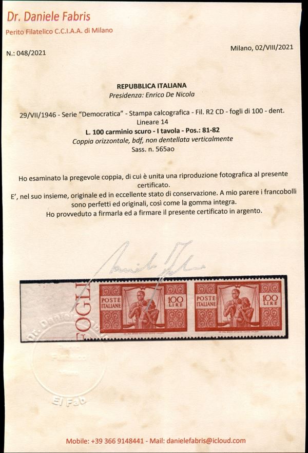 1946 - Coppia bordo foglio (Pos. 81/82) del 100 lire Democratica (565ao) non dentellata verticalmente - gomma integra - molto bella - Bolaffi + Diena + cert. Fabris
