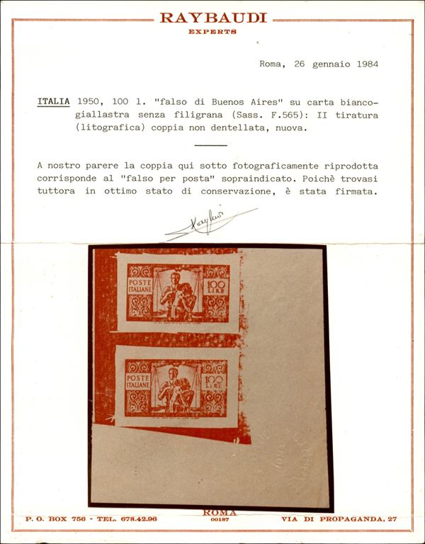 1950 - Falsi di Buenos Aires - coppia angolo di foglio del 100 lire Democratica (F565A) II tiratura non dentellata - nuova senza gomma - cert. Raybaudi