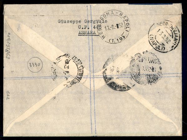BA Eritrea coppia e singolo del 65 su 8 pence (21) su aerogramma raccomandato da Asmara a Secondigliano del 12.8.52 - in tariffa