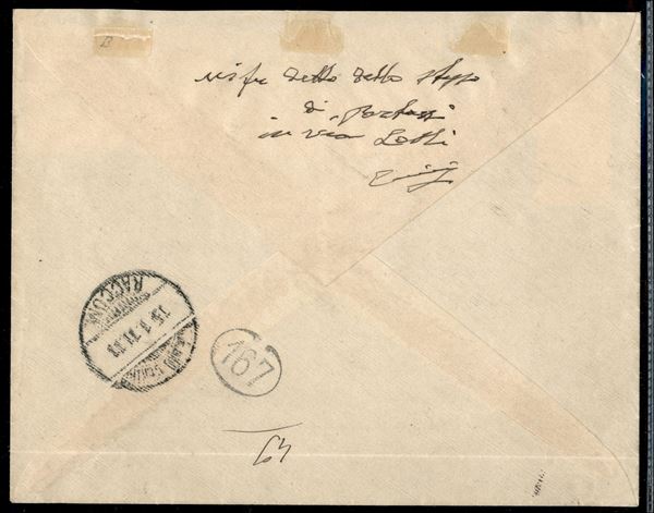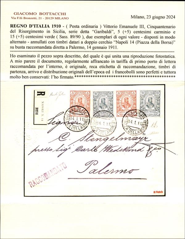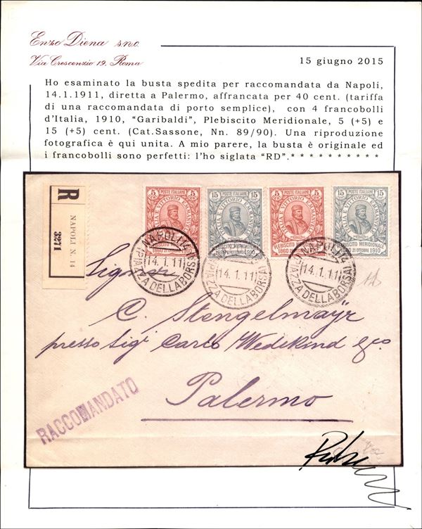 Bella raccomandata in tariffa affrancata con due 5 + 5 cent + due 15 + 5 cent Risorgimento (89/90) da Napoli a Palermo del 14.1.11 - ottimo stato di conservazione con annulli nitidi e francobolli perfetti - Fabris + cert. E. Diena + cert. Bottacchi