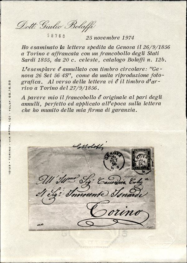 Bell'esemplare del 20 cent cobalto latteo chiaro (15c) su lettera da Genova a Torino del 26.9.56 - molto bello - ex coll. Provera - cert. Bolaffi