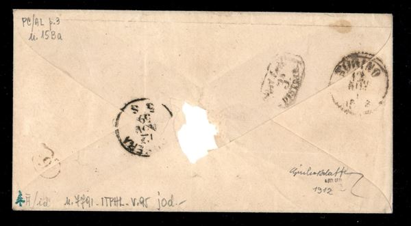 Bobbio (P.ti 3) - esemplare ben marginato del 20 cent cobalto oltremare (15Ba) su busta per Torino - ex coll. Provera - Giulio Bolaffi