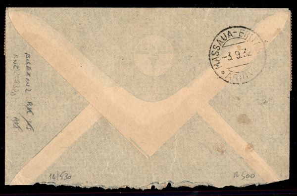 Busta affrancata con 10 cent + 20 cent Dante Alighieri (11 + 13) + tre 30 cent Garibaldi (4) + 5 cent Eritrea (156) da Asmara a Aden del 3.9.32 - in tariffa - rara destinazione - busta rifilata in basso per l'apertura