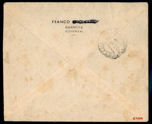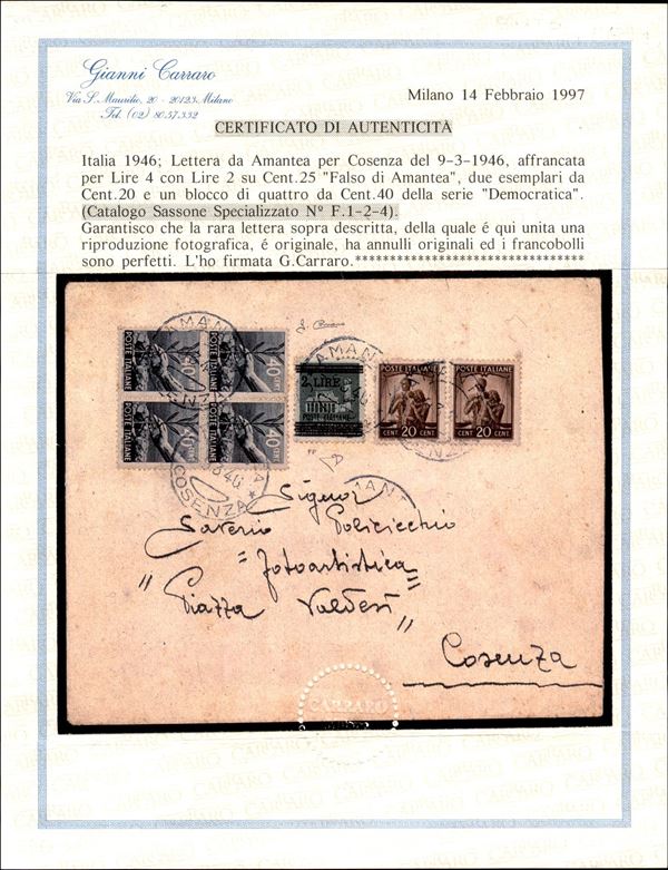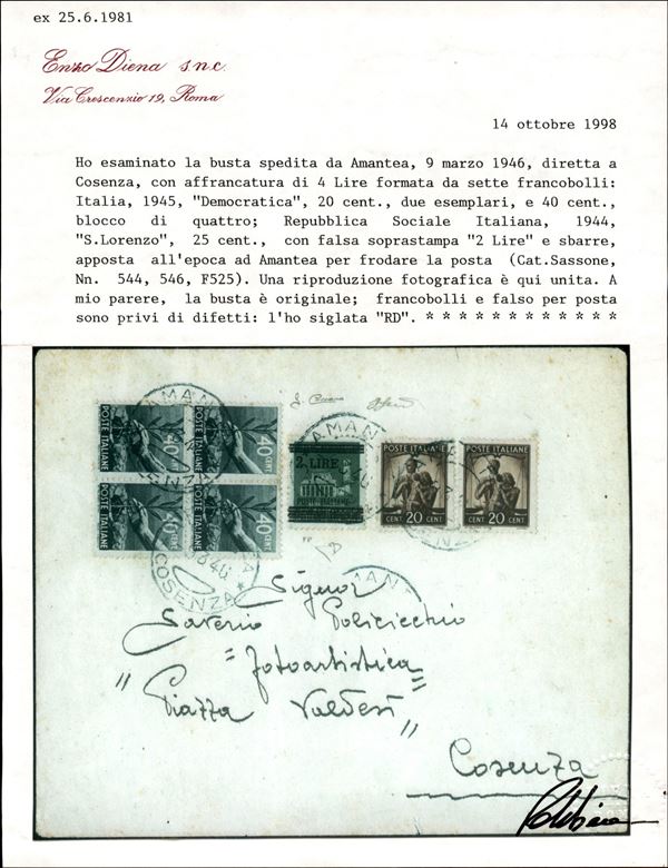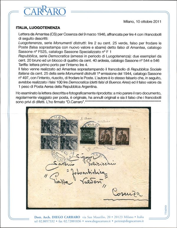Busta affrancata con Monumenti Distrutti 2 lire su 25 cent verde (F525) + complementari Democratica (due 544 + quattro 546) da Amantea a Cosenza del 9.3.46 - splendida bella e molto rara - Fabris + cert. Diena + cert. G. Carraro + cert. Carraro