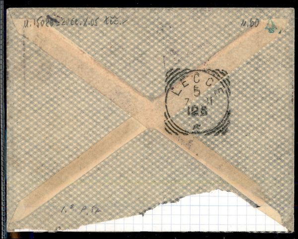 Busta con due 10 cent (60) annullati R. a Nave Vettor Pisani in d.c. - spedita da Wu Sung (Cina) per Lecce - ex coll. Provera