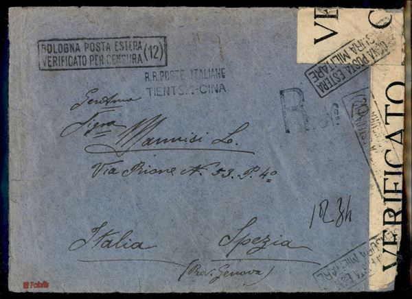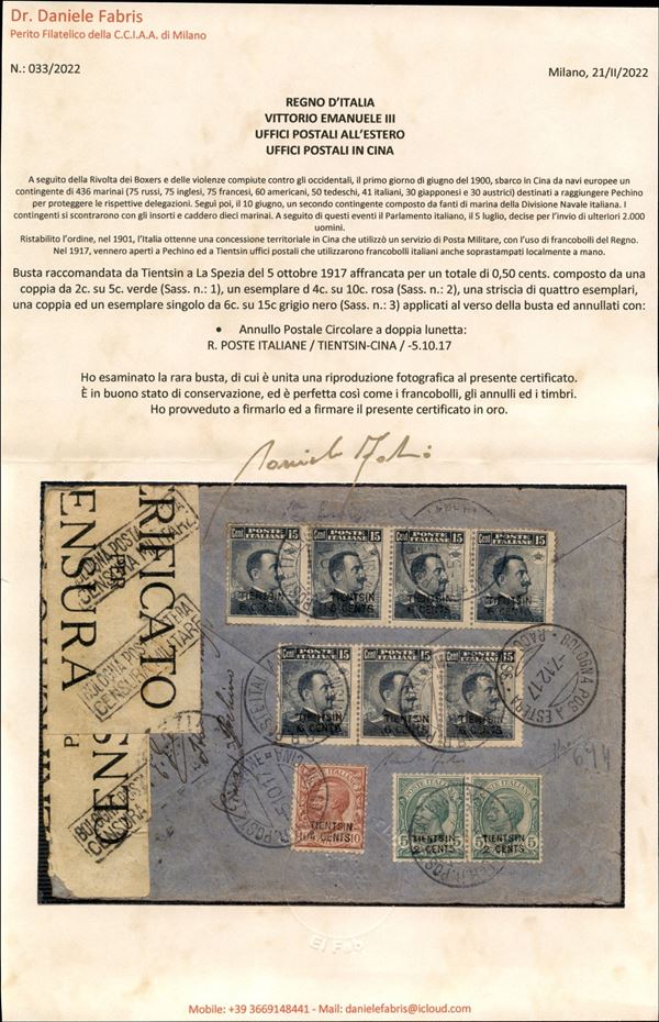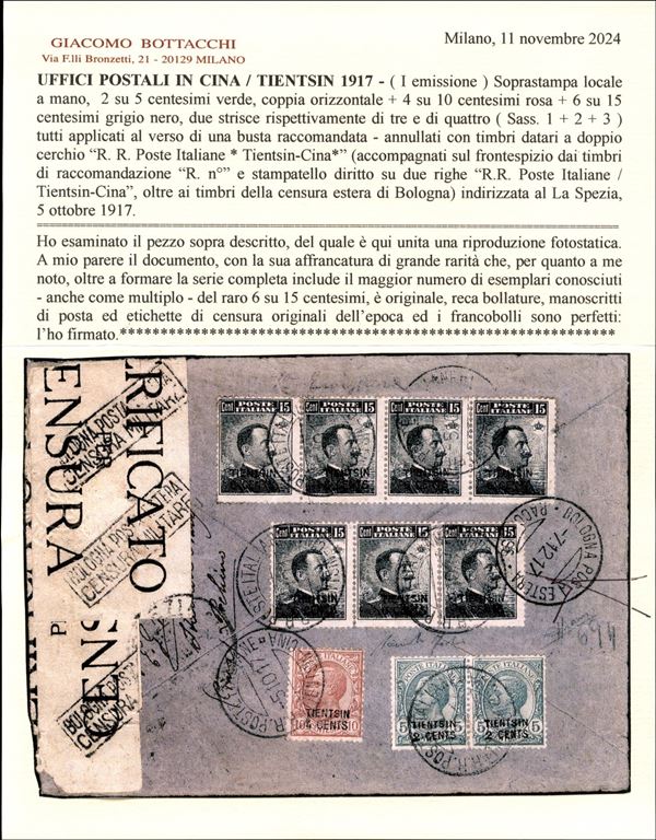 Busta raccomandata con affrancatura multipla dei primi tre valori soprastampati a mano (due 1 + 2 + sette 3) per un totale di 50 cent da Tientsin a La Spezia del 5.10.17 - splendida e molto rara sia per la qualità di valori della prima emissione sia come multiplo - cert. Sorani + cert. Bottacchi + cert. oro Fabris
