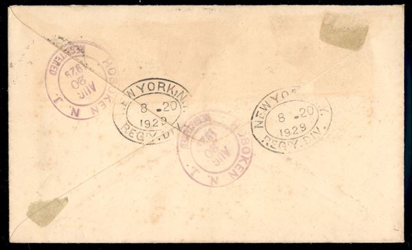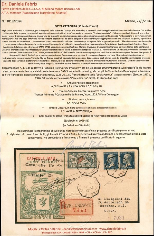 Catapult Mail - Busta raccomandata affrancata con valori di Francia (Scott 131 + due 196) da Le Havre a Hoboken (New Jersey) del 19.8.29 - firma del pilota Luis Demougeot - cert. Fabris