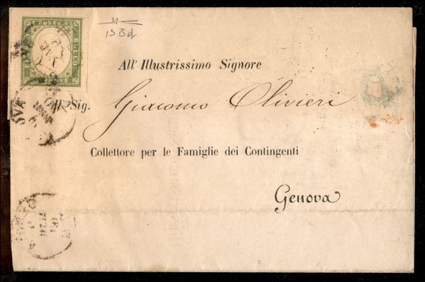 Circolare da Genova per cittą del 9 marzo 1860 affrancata con 5 cent. verde oliva grigiastro chiaro III tav. (Sass 13Bd). Rare le circolari per cittą. Cert. Manzoni