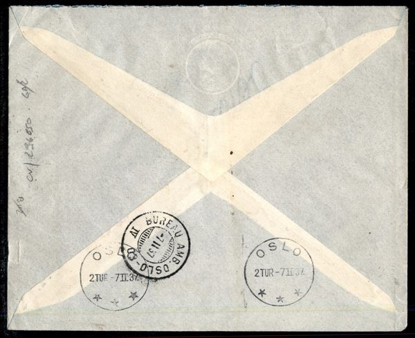 Decennale Fiera di Tripoli 1,25 lire (139) + 60 cent Posta Aerea Tripolitania (10) su aerogramma da Tripoli a Oslo (Norvegia) del 3.2.37 - rara destinazione