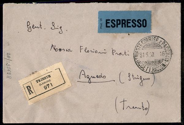 Democratica 100 lire + 25 lire (65 + 67) al retro di raccomandata espresso da Trieste a Agnedo (Strigno) del 31.5.50 - molto bella