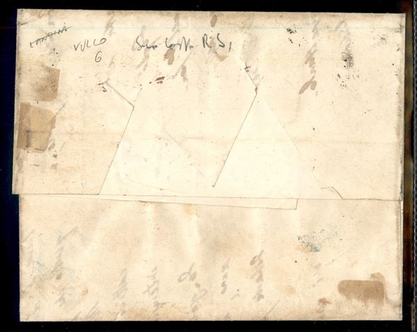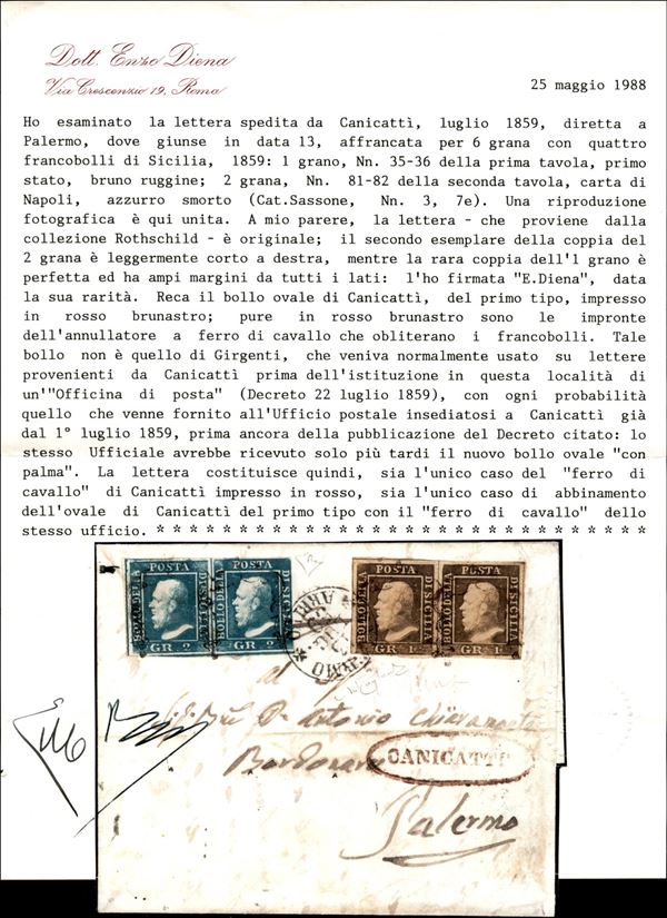 Eccezionale lettera con coppia del 1 grano bruno ruggine (3) I Tavola Pos. 35-36 e coppia del 2 grana azzurro smorto (7e) II Tavola Pos. 81-82 impostata a Canicattì (ovale rosso brunastro + ornato rosso brunastro - P.ti R3) per Palermo del 13.7.59 - unico caso noto del ferro di cavallo di Canicattì in rosso e unico caso noto di quest'ultimo in abbinamento con ovale rosso (le due impronte dell'Ufficio Postale di Canicattì) - splendida e di grande rarità - ex coll. Rothschild - cert. E. Diena
