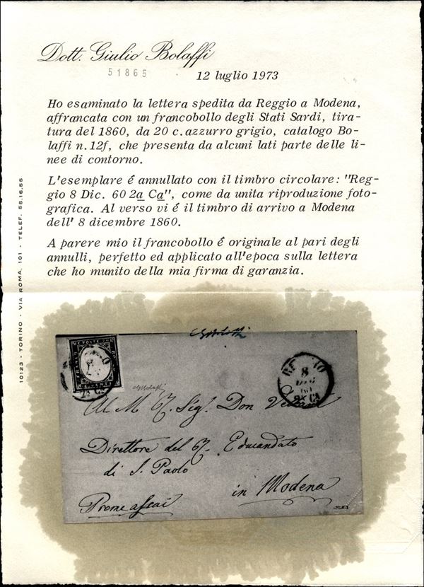 esemplare ben marginato del 20 cent azzurro grigio (15Cc) su lettera da Reggio a Modena del 8.12.60 - cert. G. Bolaffi