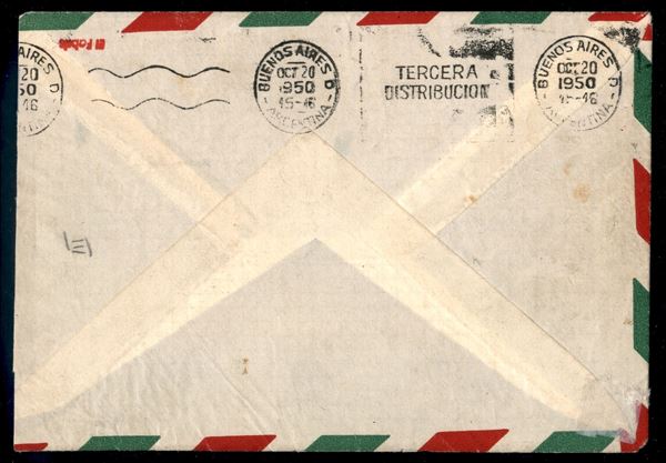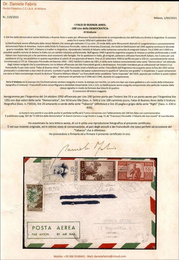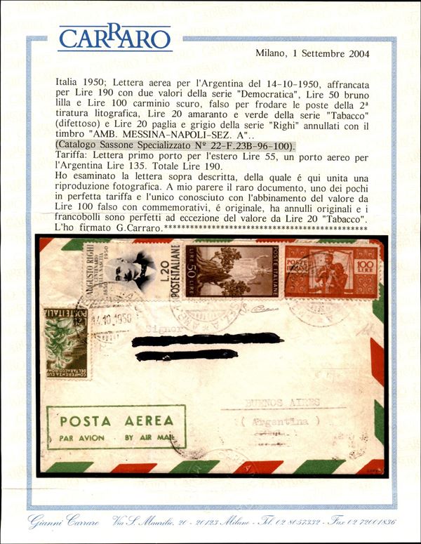 Falso di Buenos Aires - II tiratura - busta affrancata con 100 lire Democratica (F565A) + complementari (564 + 630 difettoso + 633) da Napoli a Buenos Aires del 14.10.50 - molto rara avvalorata dalla spedizione in tariffa - di pregio e di grande valore storico postale - cert. Carraro + cert. oro Fabris