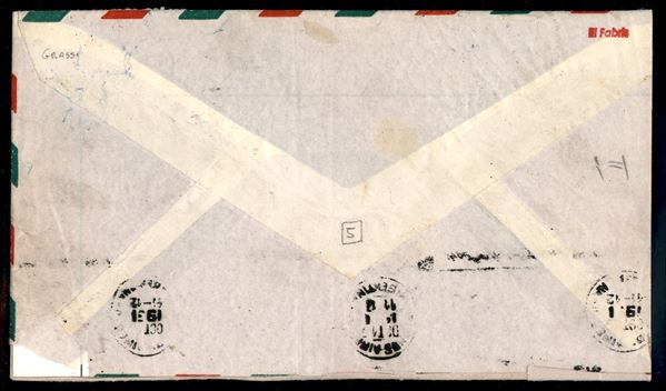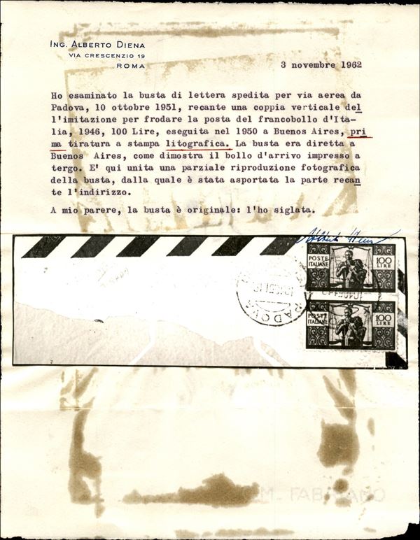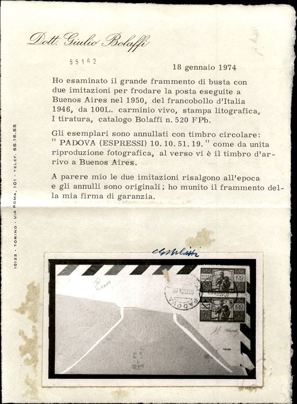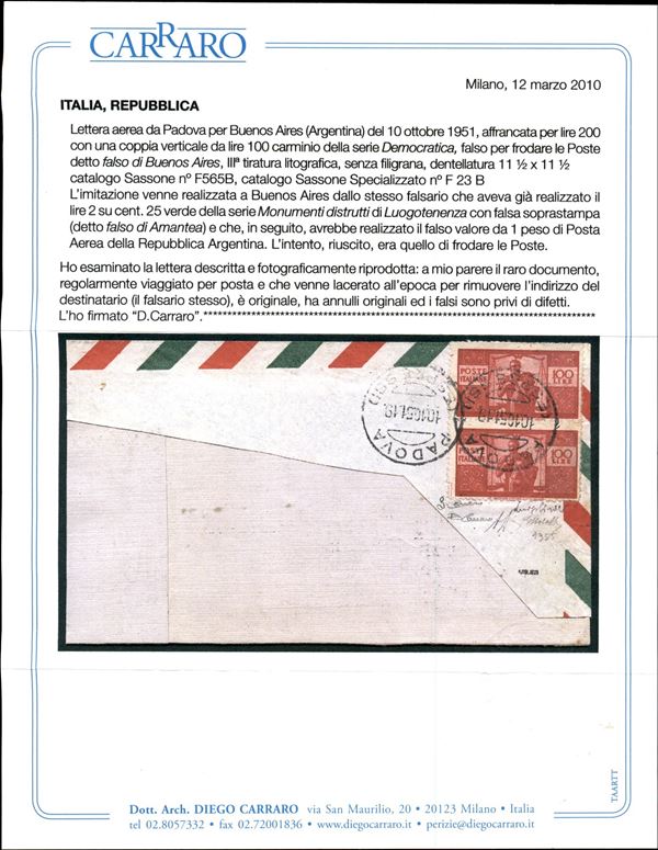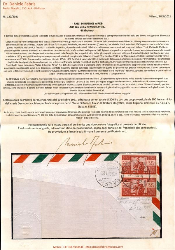 Falso di Buenos Aires - III tiratura - Grande frammento di busta affrancato con coppia del 100 lire Democratica (F565B) da Padova a Buenos Aires del 10.10.51 - molto rara e malgrado la lacerazione sul fronte dovuta al fatto che il destinatario fosse il falsario stesso resta di grande pregio e di grande valore storico filatelico - cert. A. Diena + cert. G. Bolaffi + cert. Carraro + cert. oro Fabris -