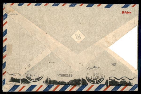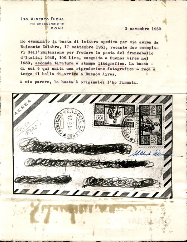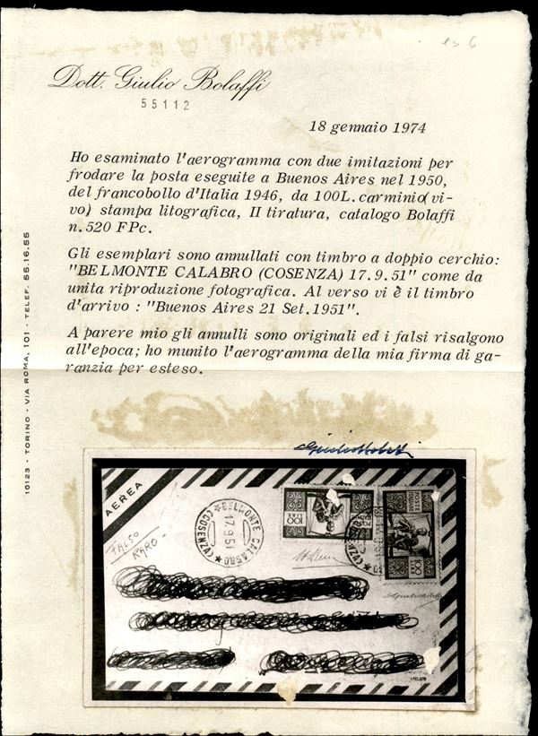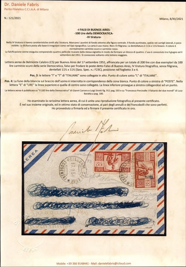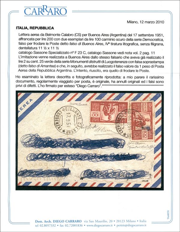 Falso di Buenos Aires - IV tiratura - Aerogramma affrancato con due 100 lire Democratica (F565C) da Belmonte Calabro a Buenos Aires del 17.9.51 - grande rarità di pregio e di grande valore storico filatelico - cert. A. Diena + cert. G. Bolaffi + cert. Carraro + cert. oro Fabris