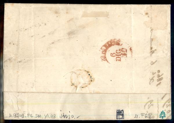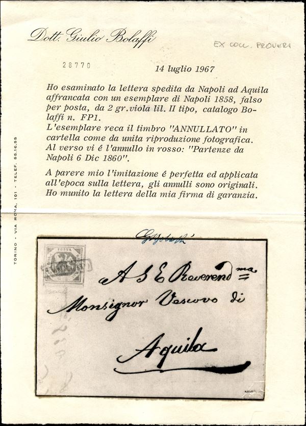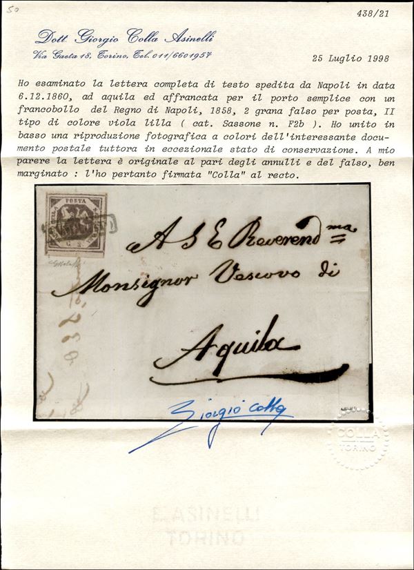 Falso per Posta - 2 grana viola lilla II tipo (F2b) su lettera da Napoli a Aquila del 6.12.60 - ben marginato e lettera in ottimo stato - cert. G. Bolaffi + cert. Colla