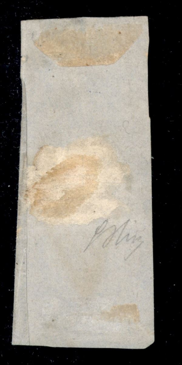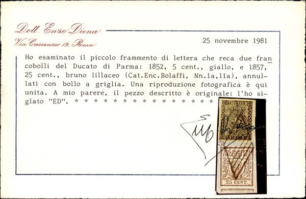 Frammento con 5 cent giallo + 25 cent bruno (1 + 10) annullo a griglietta di Piacenza - mista I/III emissione - cert. E. Diena