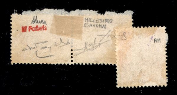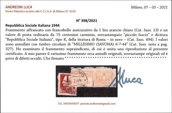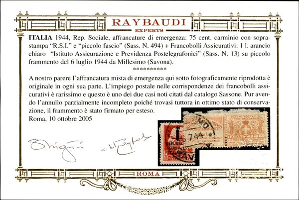 Frammento d'affrancatura d'emergenza composta da 75 cent (494) + Francobollo Assicurativo da 1 lira (13) - Millesimo (Savona) 6.7.44 - uno dei due casi usati citati dal Sassone - molto raro - cert. Andreoni + cert. oro Raybaudi