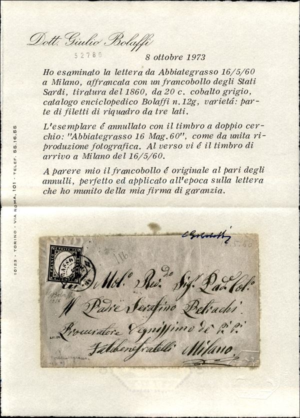 Fresca lettera con esemplare del 20 cent cobalto grigio (15Cb) ben marginato da Abbiategrasso a Milano del 16.5.60 - cert. G. Bolaffi