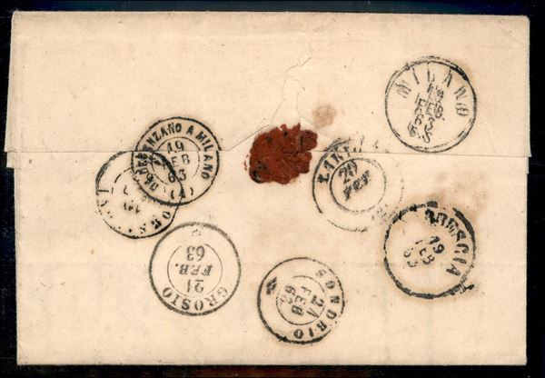 Gabbiano (P.ti 9) - striscia di tre del 5 cent (13E) su lettera per Grosio del 18.2.(63) - splendida - Giulio Bolaffi