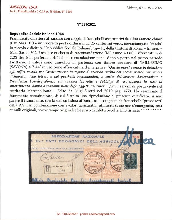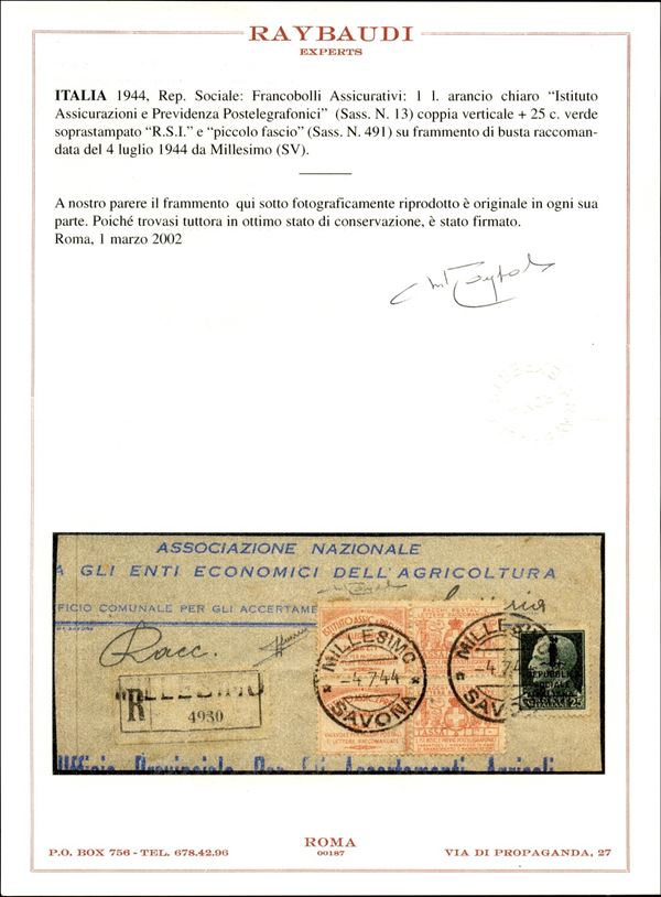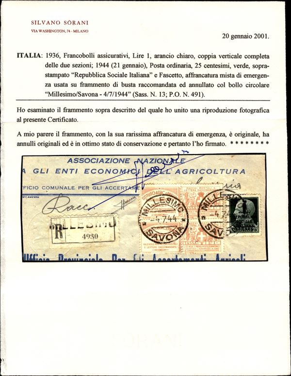 Grande frammento di raccomandata in affrancatura d'emergenza composta da 25 cent (491) + coppia del Francobollo Assicurativo 1 lira (13) - Millesimo (Savona) 4.7.44 - molto raro - cert. Sorani + cert. Raybaudi + cert. Andreoni