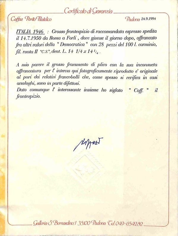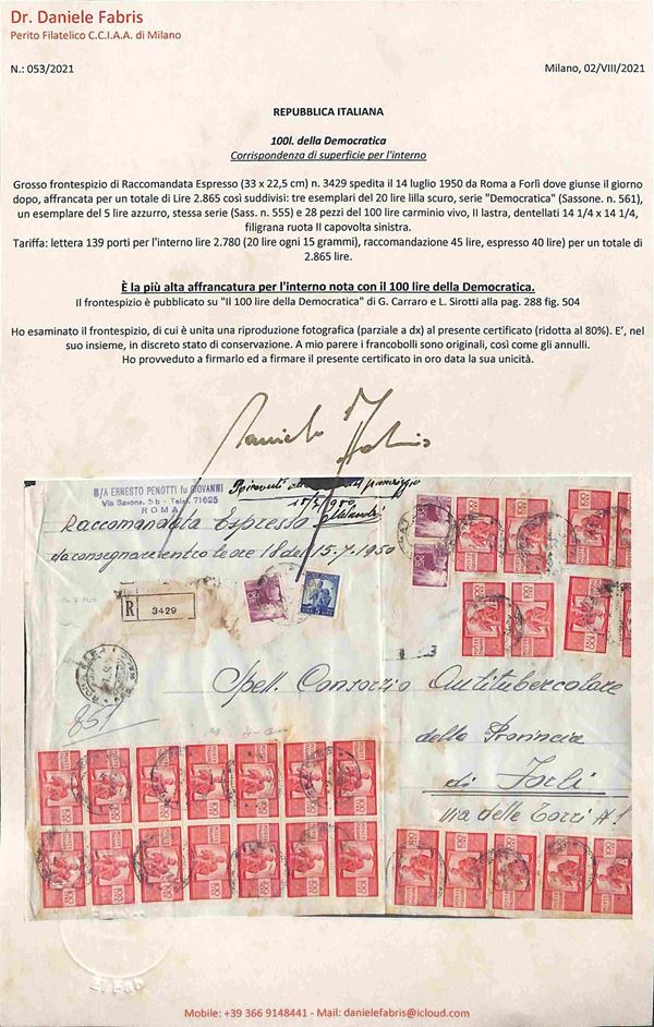Grande frontespizio di raccomandata espresso con 28 esemplari del 100 lire Democratica (565) + complementari (555 + 561) da Roma a Forlė del 14.7.50 - si tratta della pių alta affrancatura per l'interno nota con il 100 lire (riprodotta nel volume Carraro/Sirotti - Carraro + cert. Caffaz + cert. oro Fabris