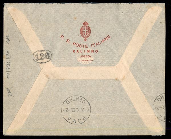 Kalymno (Egeo)/Poste Italiane 1.9.13 - striscia di tre del 5 cent soprastampato (2) su busta per Roma - molto bella