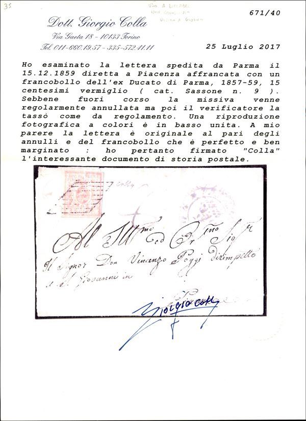 Lettera affrancata con 15 cent vermiglio (9) da Parma 15 Dec. 1859 per Piacenza (uso fuori corso della terza emissione) regolarmente viaggiata annullata e poi tassata come da regolamento - probabile uso in frode postale - interessante - Diena + cert. G. Colla