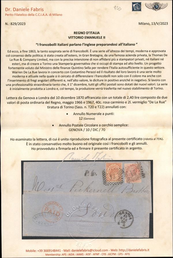 Lettera affrancata con 2 lire + 40 cent Vittorio Emanuele tiratura di Torino (T20 + T22) da Genova a Londra del 10.12.70 - molto bella - cert. Fabris