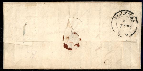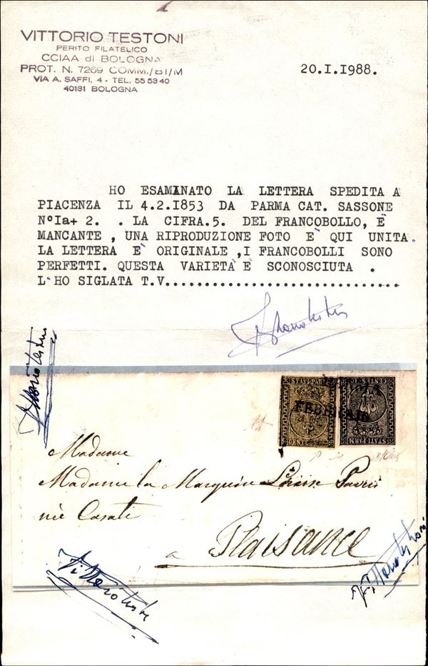Lettera affrancata con 5 cent giallo + 10 cent nero (1 + 2) da Parma 4 Febbraio 1853 per Piacenza - il valore da 5 cent è completamente privo del valore e la scritta centes è incompleta - Oliva + Diena + cert. Testoni