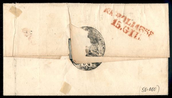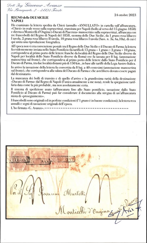 Lettera da Napoli affrancata con 1 grano rosa lillaceo I Tavola + 2 grana rosa lillaceo II Tavola e 10 grana rosa lillaceo I Tavola (3a + 6a + 10a) da Chieti 15 giugno 1858 per Monticelli d'Ongina con vari segni di tassa - si tratta dell'unica lettera oggi nota diretta nel Ducato di Parma - cert. G. Avanzo