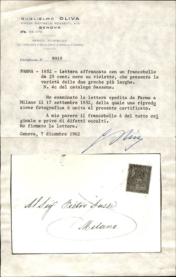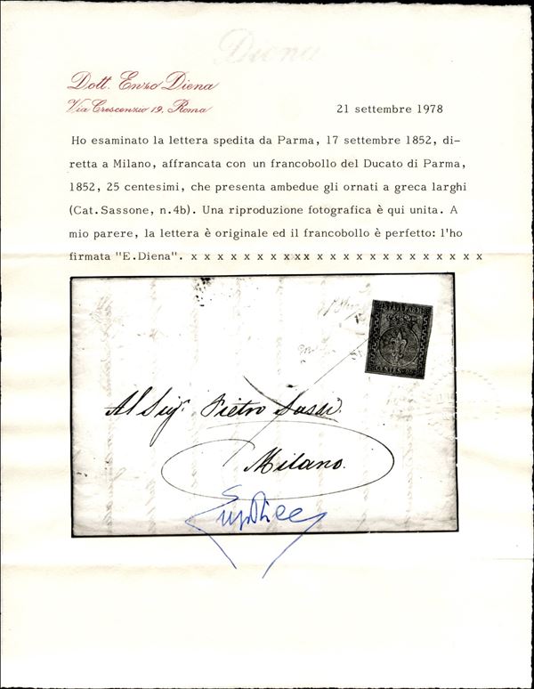 Lettera da Parma a Milano con 25 cent violetto (4b) che presenta la varietà greca larga a destra e a sinistra - Bolaffi + cert. E. Diena + cert. Oliva