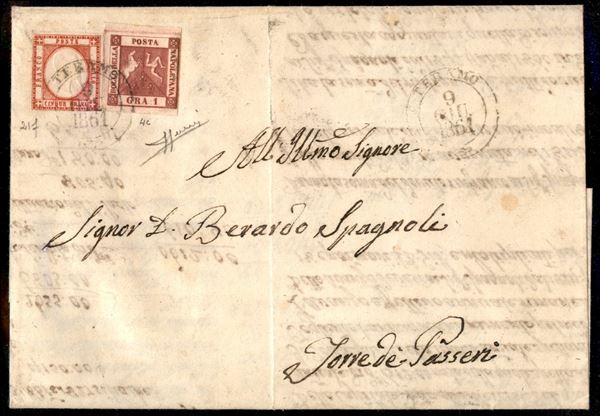 Lettera da Teramo 9 giugno 1861 affrancata con 5 gr. prov. nap. + 1 gr. Napoli (Sass. 4c, 21f) in rara affrancatura mista per Torre de Passeri cert. Sorani (Sass. Mista p. 7/R1)