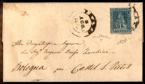 Lettera gialla da Prato e Castel San Pietro del 3 agosto 1855 affrancata con 2 crazie (Sass. 5) annullato col doppio cerchio I tipo (p. 5). Rara lettera in tariffa limitrofa. Cert. Manzoni