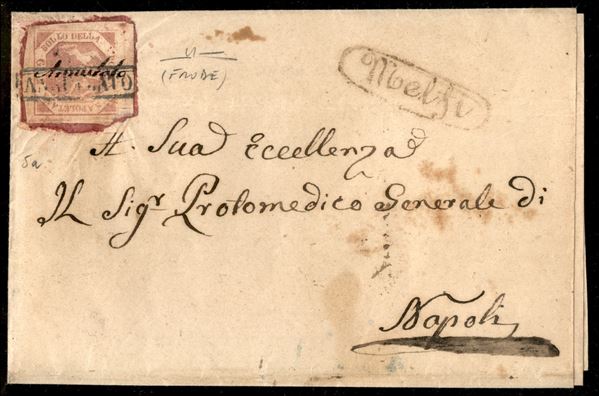 Lettera spedita da Melfi per Napoli e affrancata con 2 gr. I tav. rosa lillaceo riutilizzato il 28 aprile 1858 e annullato con scritta a penna (p. 13). Bella e rara FRODE postale non scoperta (Sass. 5a). Cert. Manzoni