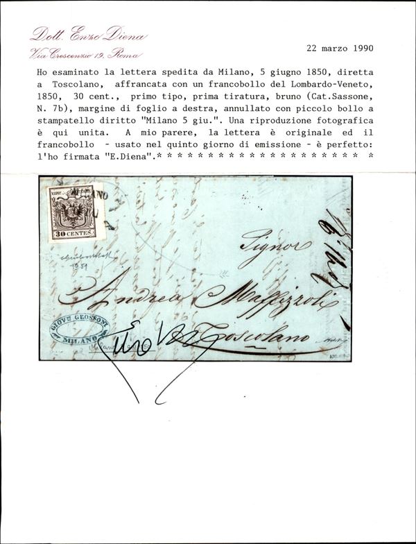 Milano (stampatello - P.ti 6) - Lettera affrancata con 30 cent bruno (7) I tipo con bordo di foglio a destra per Toscolano del 5.6.50 (quinto giorno d'uso) - molto bella - Giulio Bolaffi + cert. E. Diena