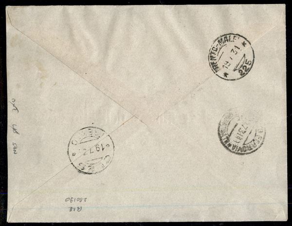 Milizia 30 cent in striscia di cinque (272) + complementari su raccomandata da Mezzolombardo a Cles del 18.7.31 - in tariffa - molto bella