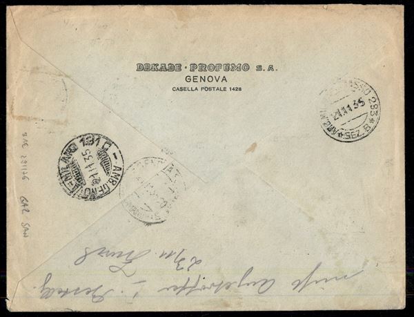 Milizia 4° emissione 20 + 10 cent 25 + 15 cent e 50 + 30 cent (380/382) + Bellini e Littorali (392 + 92 + 378) su aerogramma raccomandato da Genova a Bremen del 21.11.35 - non comune