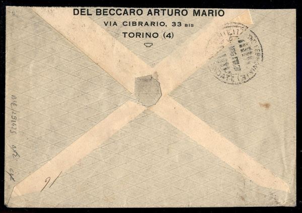 Milzia 1° emissione coppia 1,25 + 60 cent + 60 + 30 cent (208 + 207) su raccomandata espresso da Piacenza a Torino del 9.6.27 - molto bella