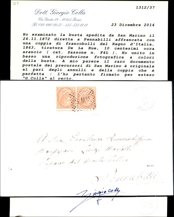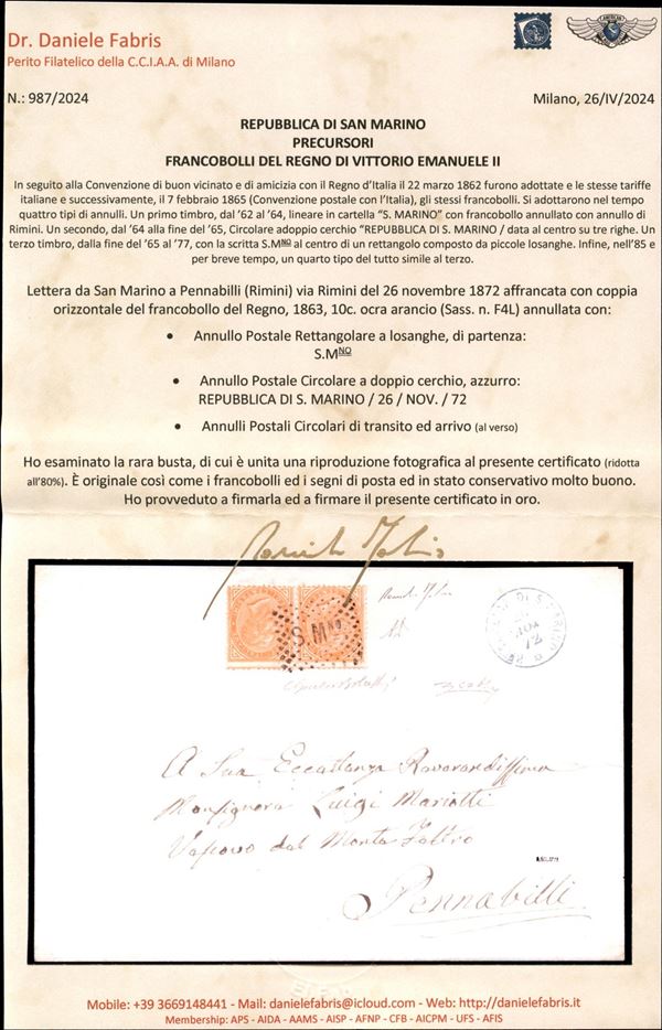 Precursori - Busta annullata S. Mno (losanghe nero) del 26.11.72 su coppia del 10 cent (F4L) per Pennabilli - splendida e rara - Giulio Bolaffi + Diena + cert. Colla + cert. oro Fabris
