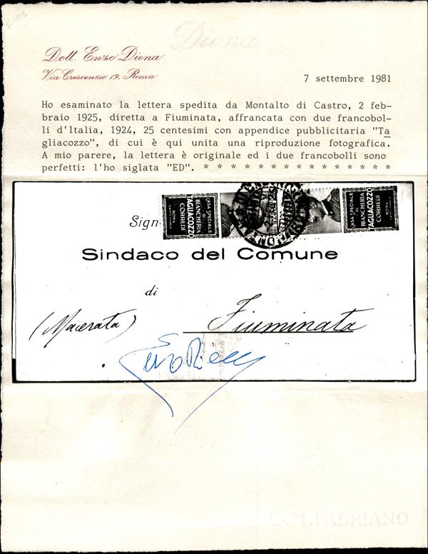Pubblicitari - Due esemplari 25 cent Tagliacozzo (8) su piego da Montalto di Castro a Fiuminata del 2.2.25 - in tariffa manoscritti - non comune uso - cert. Diena