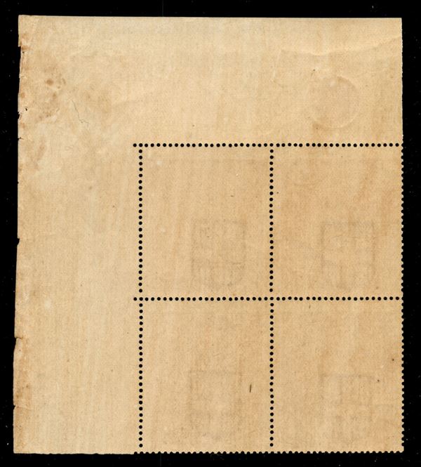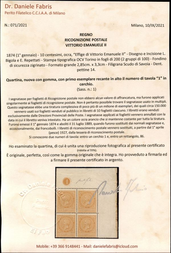 Quartina del 10 cent ocra arancio (1) angolo di foglio con numero di Tavola "1" in cerchio in alto a sinistra - gomma integra - cert. Fabris