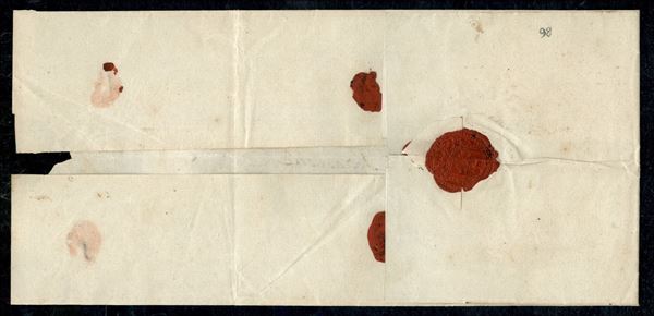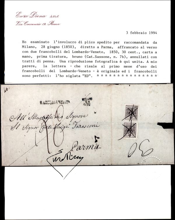 Raccomandata da Milano 28 Giu. del 1850 affrancata al verso con due esemplari da 30 cent bruno (7b) - segno di tassazione al retro di 30 centesimi e al verso di 28 decimi - molto interessante oltre ad essere viaggiata nel I mese d'uso dei francobolli - Vaccari + cert. E. Diena