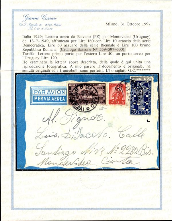 Repubblica Romana 100 lire + Biennale 50 lire + Democratica 10 lire (559 + 597 + 600) su aerogramma da Balvano a Montevideo del 13.7.49 - molto bello e raro - cert. Carraro