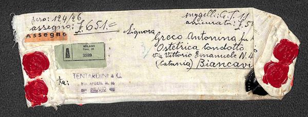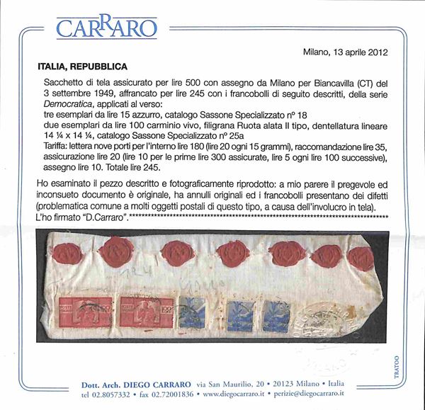 Sacchetto di tela assicurato per 500 lire con assegno e affrancato due 100 lire Democratica (565) + tre 15 lire (560) da Milano a Biancavilla del 3.9.49 - molto bello e inconsueto - cert. Carraro